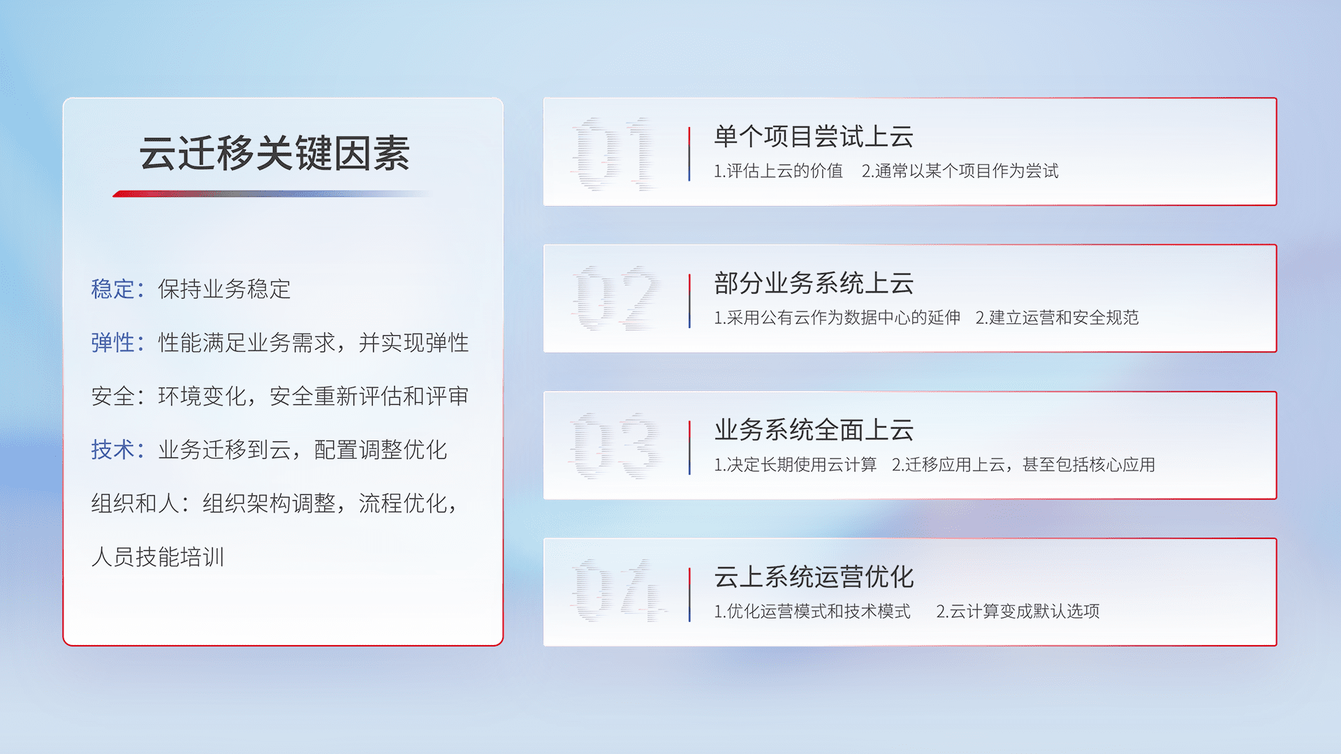 结合实际业务,,从规划设计、、、云平台选型、、、、云原生改造、、、、数据迁移、、、、集成交付,,,迁移全过程为客户识别最佳上云路径,,,,做好风险识别管理,,,,设计网络架构、、、身份权限、、、安全审计合规、、、操作审计、、日志审计、、监控告警策略、、、多站点容灾设计等,,,,对云上基础设施进行整体规划,,提升IT治理水平,,,以满足弹性、、高可用、、高性能的需求。。。。