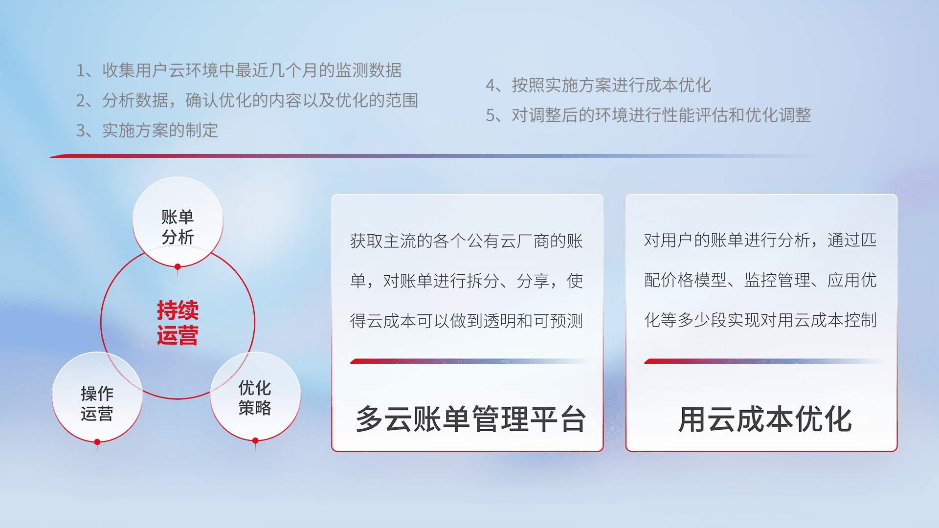 通过多云纳管,,,,以统一的资源数据模型把客户的云资源进行抽象和封装,,,进而实现对多云资源的统一操作,,保障云资源管理的可靠性、、稳定性与可用性。。。。量身定制化运维内容,,,配置、、开发运维、、、、补丁管理、、备份、、监控、、、认证和访问管理、、、、审计和日常巡检等,,,,保障在用云过程中的可靠度,,,稳定度以及高可用率。。。